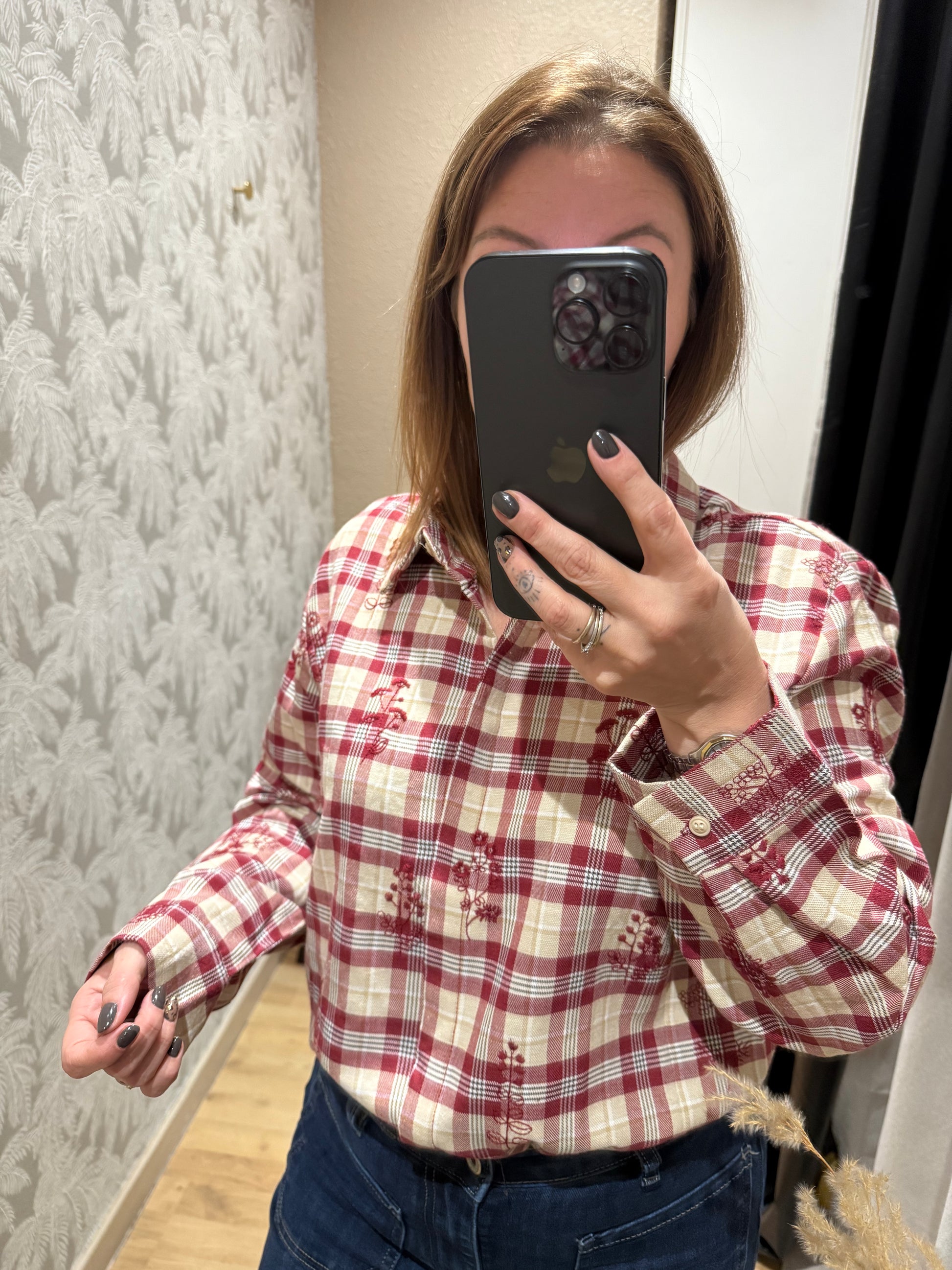 - Chemise principalement dans les tons de bordeaux / beige et blanc cassé